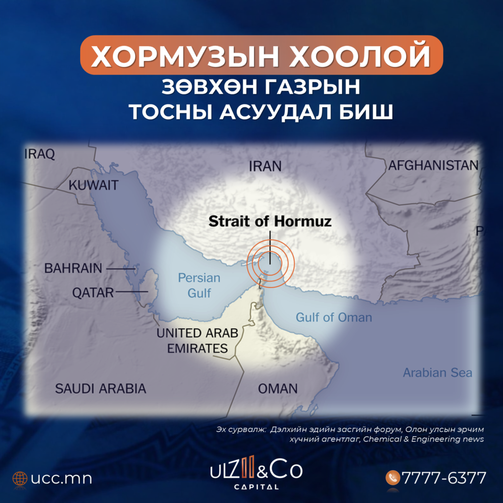 Сүүлийн 2 долоо хоногийн турш (2026.03.16) Ойрх Дорнодод өрнөөд буй дайны нөхцөл байдал ойрын хугацаанд дуусах магадлал улам багасаж байгаа нь хөрөнгө оруулагчдын санааг чилээж байгаа бол энэ удаагийн дугаарт бид “Хормузын хоолой” хаагдсан нь газрын тосноос бусад салбаруудад хэрхэн нөлөөлж болох талаар мэдээлэл бэлтгэн хүргэж байна.