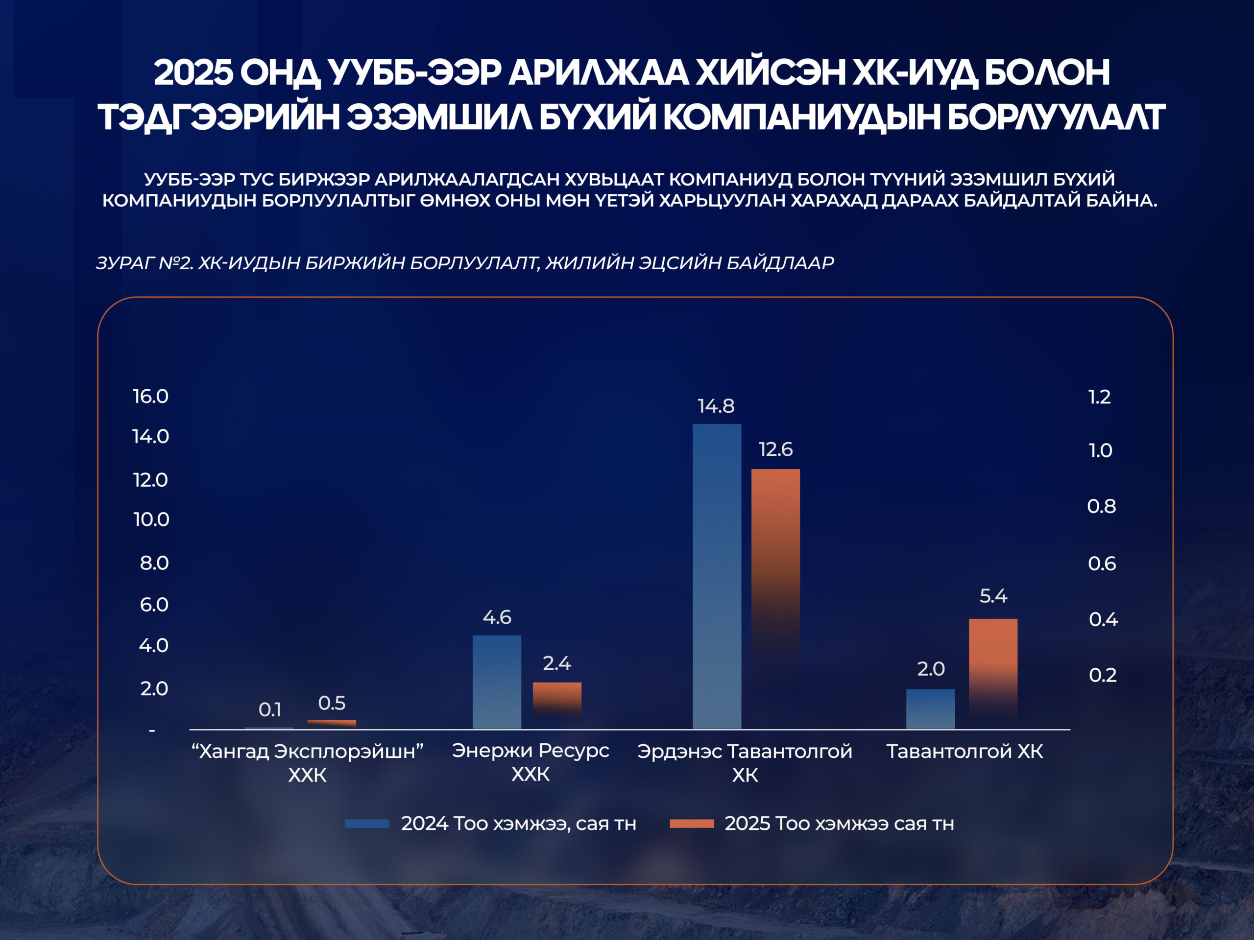 Дээрх зургаас харахад Хонг Конгийн биржид бүртгэлтэй Монголиан Майнинг Корпорэйшн ХК (SEHK: 975)-ийн 100.0%-ийн эзэмшил Энержи ресурс ХХК болон 80.0%-ийн эзэмшилтэй Хангад Эксплорэйшн ХХК-ийн арилжаа нийлбэр дүнгээр өнгөрсөн оны мөн үеэс ойролцоогоор 38.9%-иар буурч, 2.9 сая тонн болсон бол Монголын хөрөнгийн биржид бүртгэлтэй, хөрөнгө оруулагчдын хэлж заншсанаар “жижиг тавантолгой” буюу орон нутгийн өмчит Тавантолгой ХК-ийн борлуулалт ӨОМҮ-ээс 2.6 дахин нэмэгдэж, 5.0 сая тонн болсон байна.