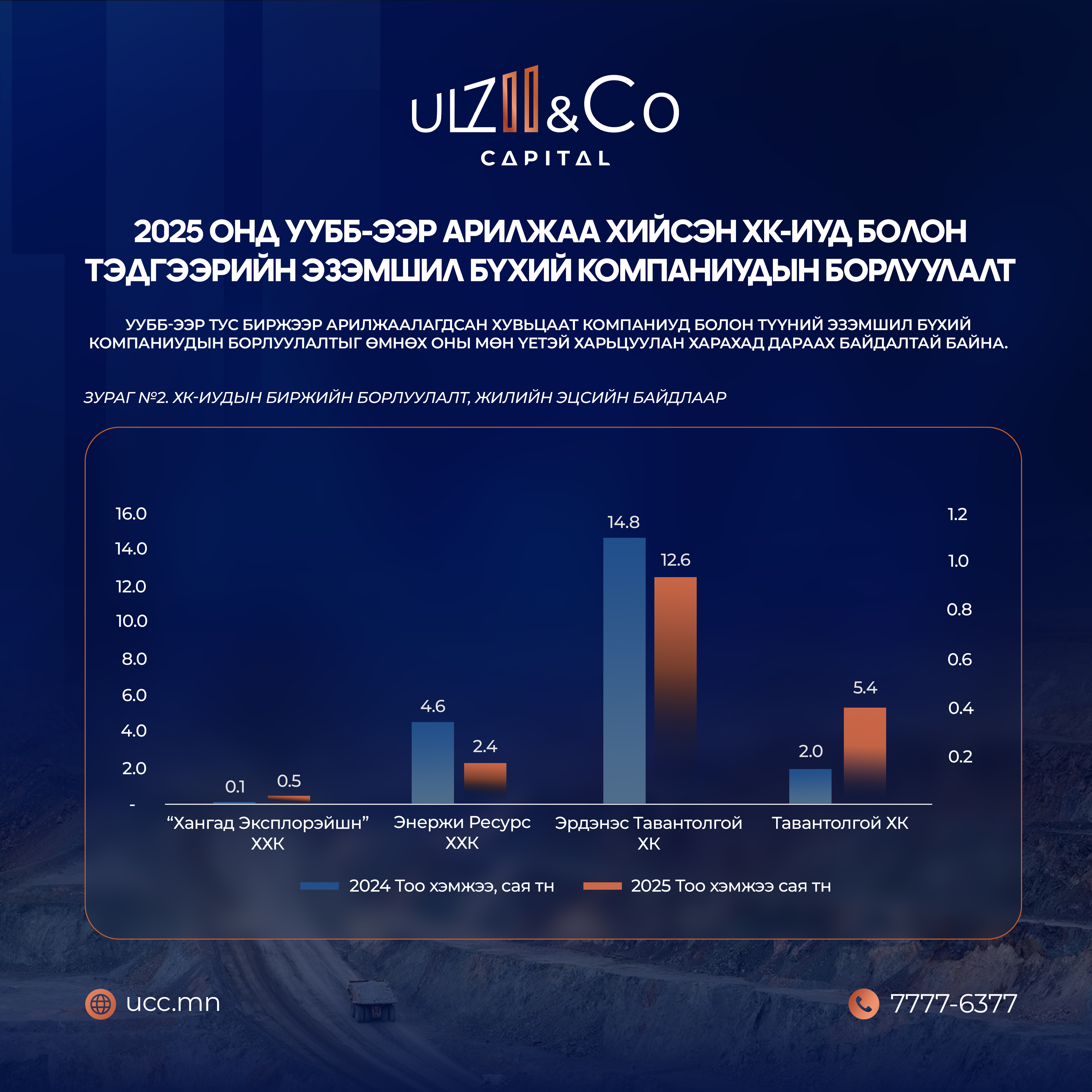 Дээрх зургаас харахад Хонг Конгийн биржид бүртгэлтэй Монголиан Майнинг Корпорэйшн ХК (SEHK: 975)-ийн 100.0%-ийн эзэмшил Энержи ресурс ХХК болон 80.0%-ийн эзэмшилтэй Хангад Эксплорэйшн ХХК-ийн арилжаа нийлбэр дүнгээр өнгөрсөн оны мөн үеэс ойролцоогоор 38.9%-иар буурч, 2.9 сая тонн болсон бол Монголын хөрөнгийн биржид бүртгэлтэй, хөрөнгө оруулагчдын хэлж заншсанаар “жижиг тавантолгой” буюу орон нутгийн өмчит Тавантолгой ХК-ийн борлуулалт ӨОМҮ-ээс 2.6 дахин нэмэгдэж, 5.0 сая тонн болсон байна.
